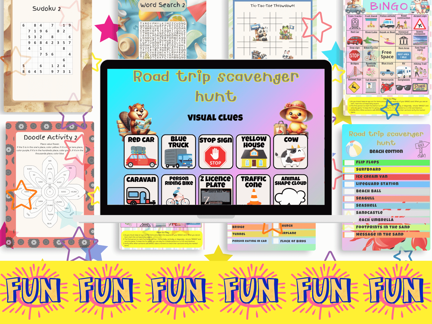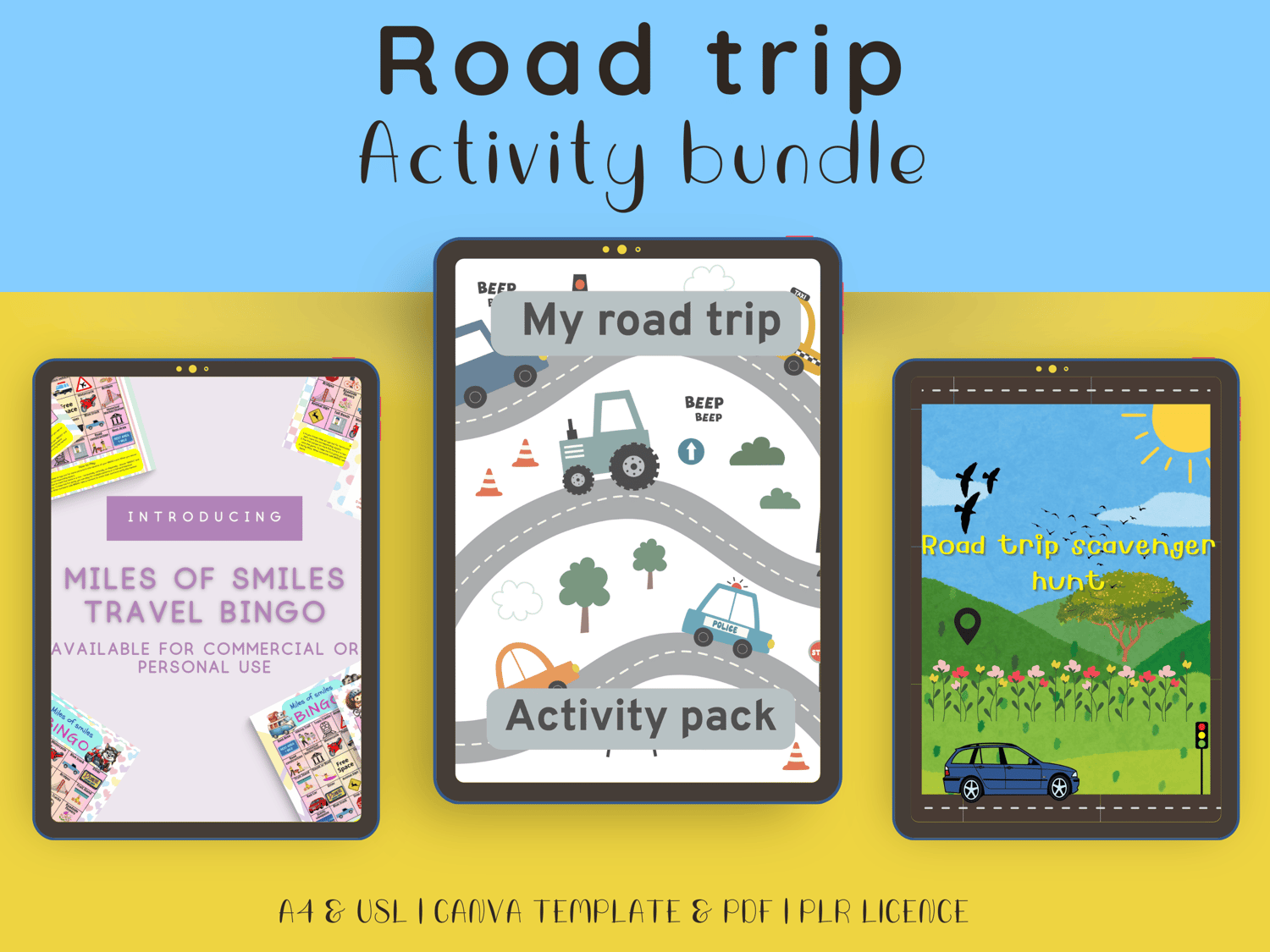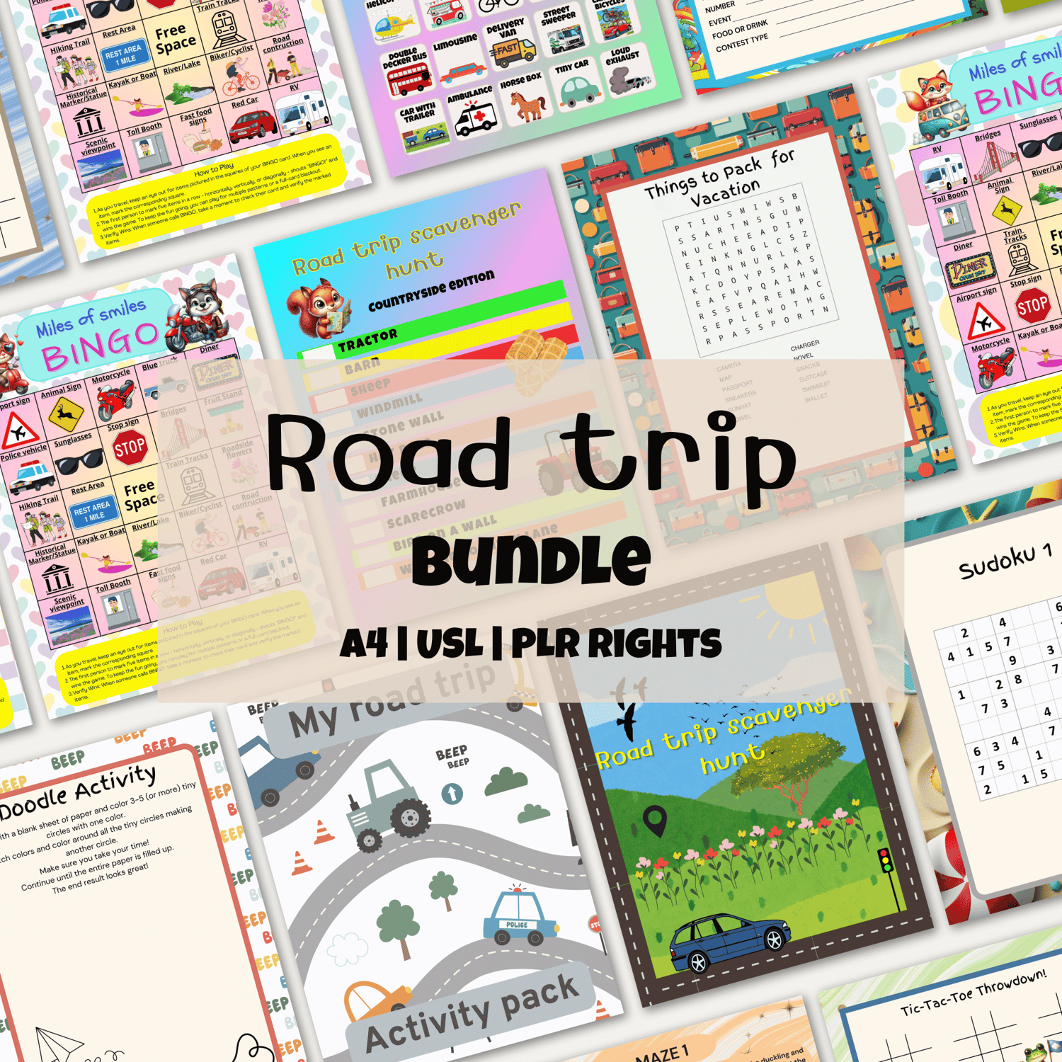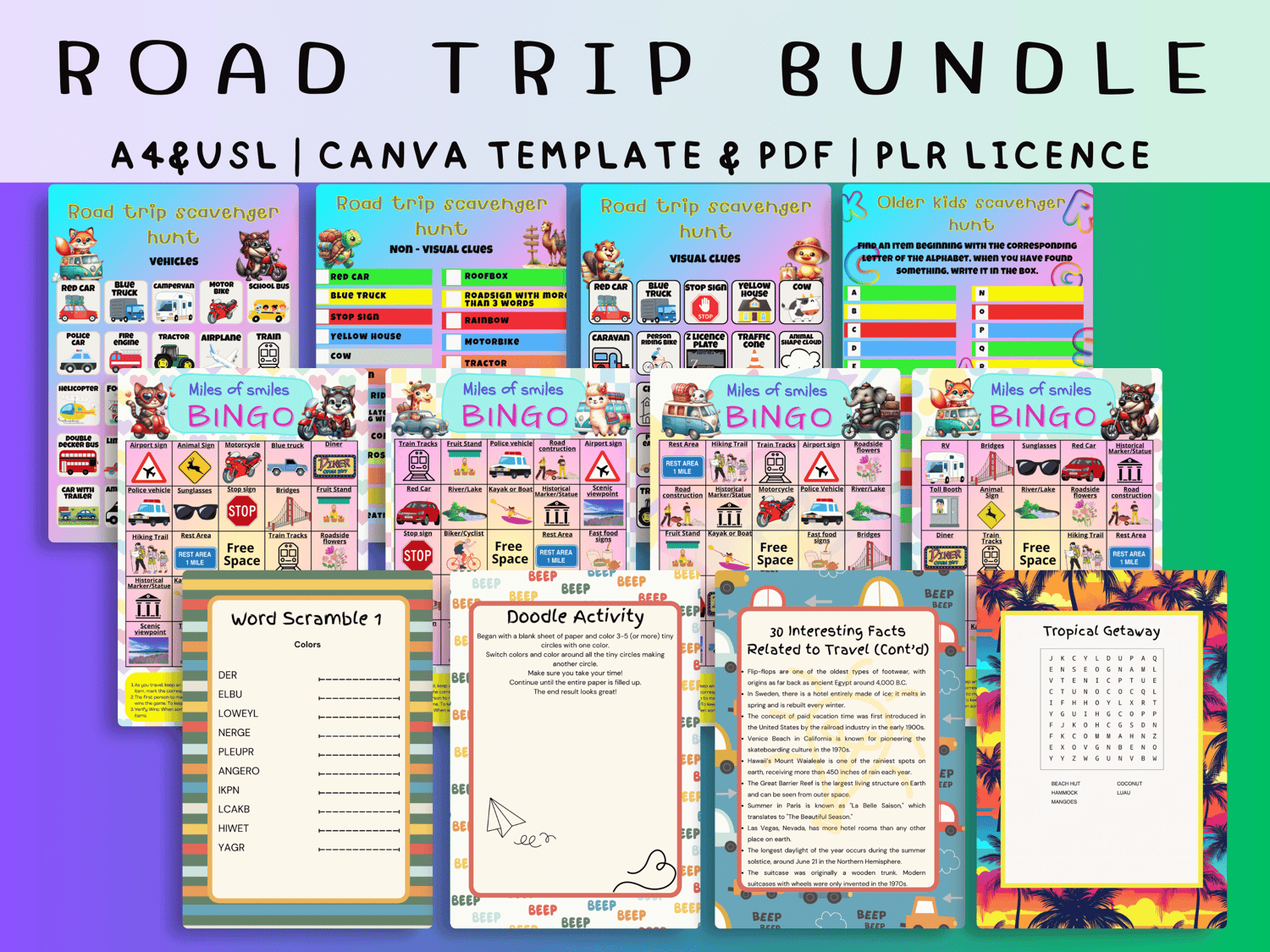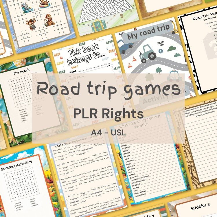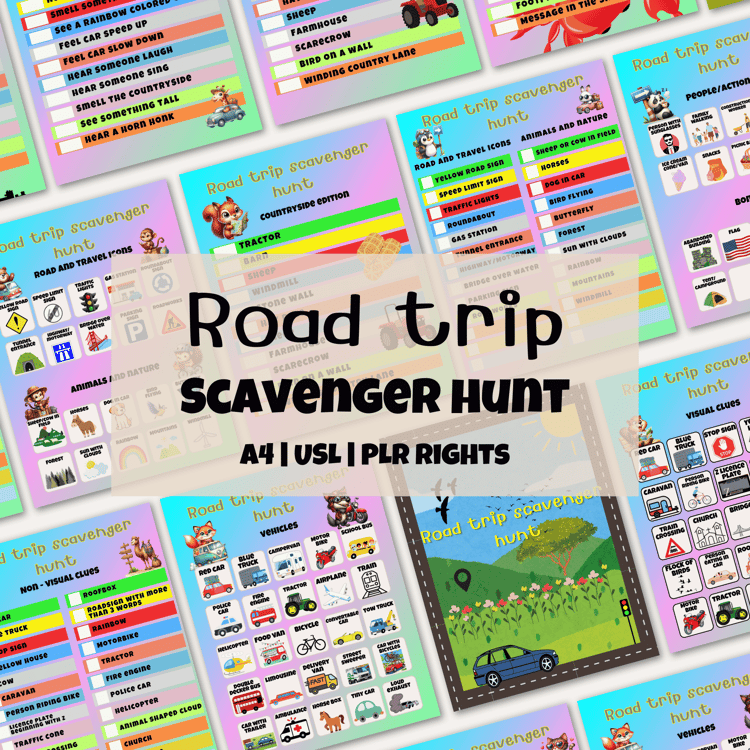 This 78-page Road Trip Bundle includes three best-selling activities (Scavenger Hunt, Bingo, and Mini Games) - all editable in Canva and ready to resell with PLR.